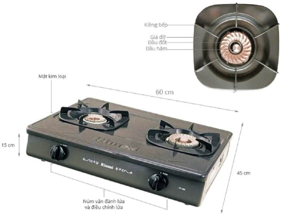 – Kiềng bếp bằng kim loại phủ men: Bếp gas Rinnai RV-365(G)N ,chén đồng nguyên khối có đầu hâm nhỏ lửa có kiềng bếp Độ bền cao, không bị méo mó hay bị bào mòn dưới áp lực của xoong nồi lớn và nhiệt độ cao. Bao phủ bên ngoài kiềng là lớp men tráng màu đen đơn giản, tinh tế và vệ sinh dễ dàng.