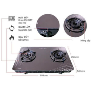 – Mặt bếp bằng kính Schott. – Khung sườn thép phủ sơn. – Kiềng thép phủ men. – Đầu đốt bằng đồng thau. |