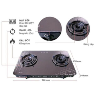 – Mặt kính Schott chịu lực, chịu nhiệt tốt – Thân bếp thép phủ men chống bám, chống trầy – Đầu đốt bằng đồng thau, điếu bằng gang – Kiềng bếp thép tráng men – Hệ thống đánh lửa Magneto – Lượng gas tiêu thụ 0,42Kg/h/lò – Kích thước bếp 720 x 450mm – Trọng lượng 9,5Kg  |