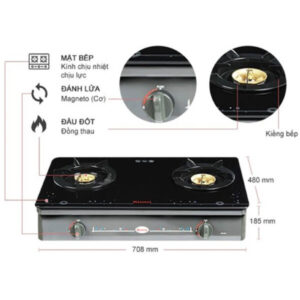 – Mặt bếp bằng kính cường lực – chịu nhiệt. – Khung sườn thép phủ sơn. – Kiềng thép phủ men. – Đầu đốt bằng đồng thau.  |