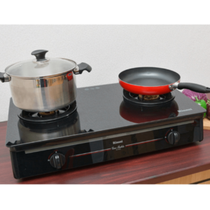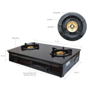 – Mặt bếp bằng kính cường lực. – Khung sườn thép phủ sơn. – Đầu đốt bằng đồng thau. – Kiềng bếp bằng thép phủ men.  |